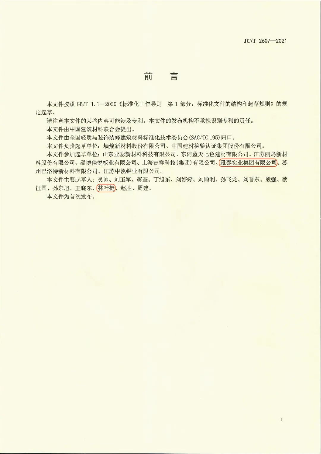 近日,由中國建筑材料聯(lián)合會提出,雅泰實業(yè)集團參與起草的《JC/T2605-2021建筑裝飾用氟碳覆膜金屬板》、《JC/T2607-2021建筑屋面用預(yù)輥涂金屬板》兩項行業(yè)標(biāo)準(zhǔn)于2021年3月5日發(fā)布,同年7月1日正式實施,公司技術(shù)部經(jīng)理林葉挺為此次兩項行業(yè)標(biāo)準(zhǔn)的主要起草人之一。