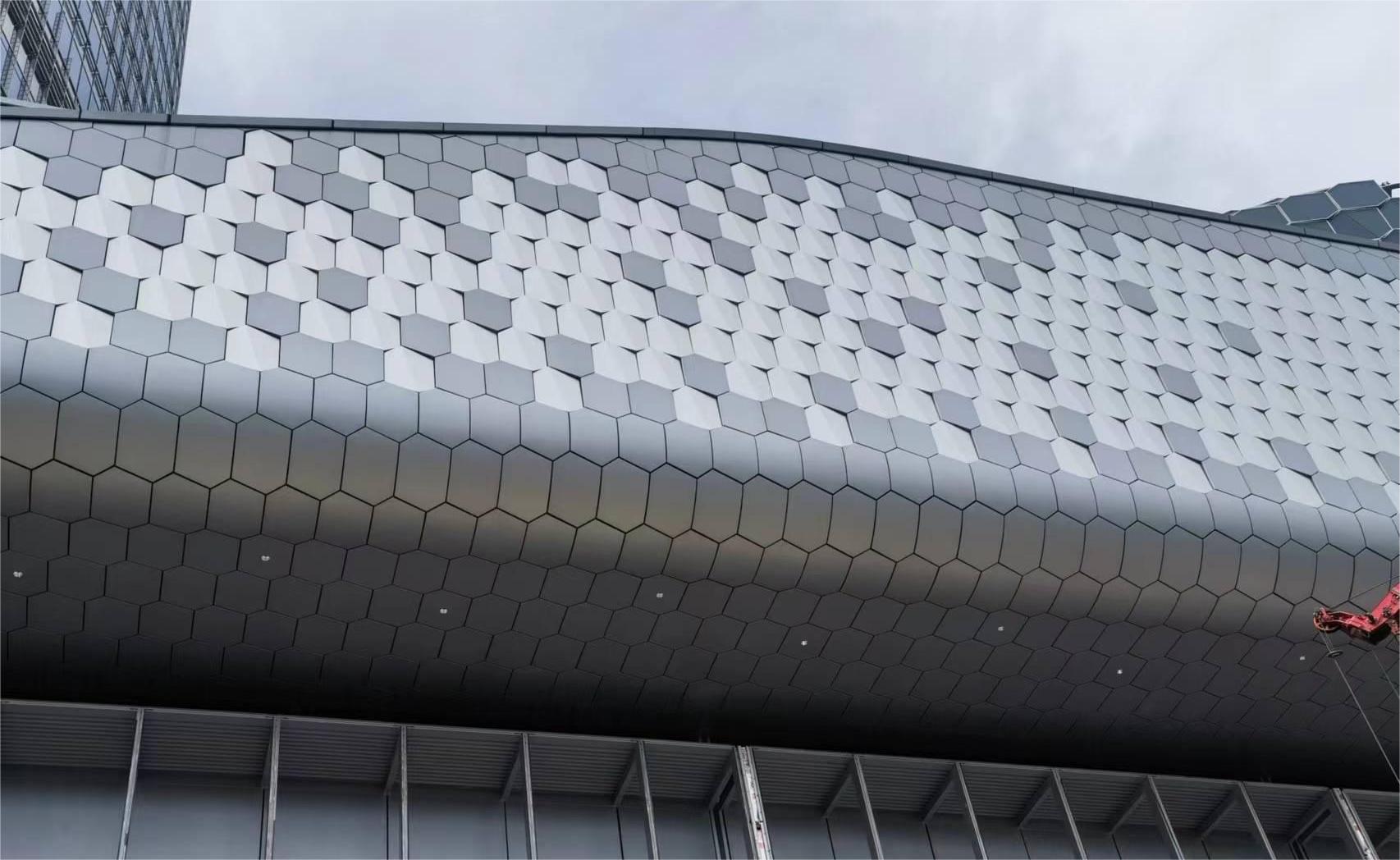 南裙樓船頭造型內(nèi)部鋼結(jié)構(gòu)均有扭轉(zhuǎn),要求拐角幕墻呈現(xiàn)雙曲面效果;屋檐幕墻設(shè)計(jì)圍繞龍鱗造型,分解為單片“六邊形”元素展開,拐角弧度造型對(duì)鋁板制造及安裝工藝要求極高。