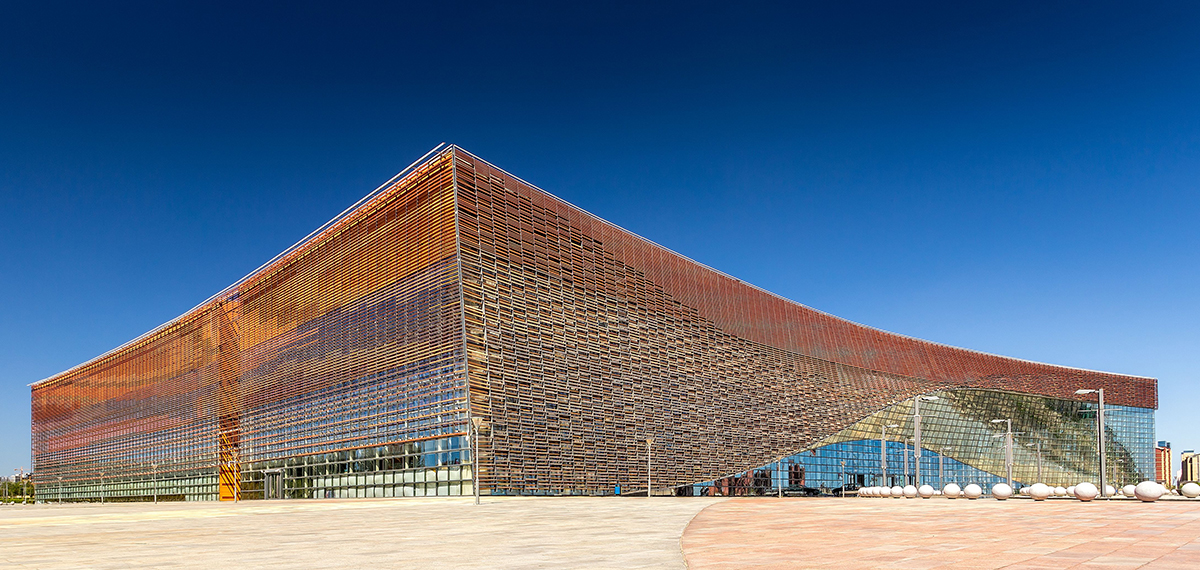 新疆克拉瑪依會展中心,1期(20,000平方米)和2期(40,000平方米)。1期會展廳可以被分隔為兩個(gè)各5,5000平方米的廳,公共大堂和廣場是室內(nèi)的,以響應(yīng)克拉瑪依寒冬氣候和盛行風(fēng)。1期的主大堂特意被做成超大尺寸以允許舉辦額外的超大展覽或?yàn)榱藵M足多個(gè)展覽的登記工作;1期大堂也通過人行天橋與2期連接。一個(gè)能夠容納超過300人的會議區(qū)域被置于大堂的上一層。